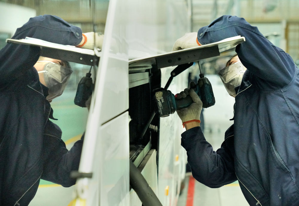 3 月 8 日,工作人員在宇通新能源廠區(qū)高端及海外承裝車間里作業(yè) 李安 / 攝