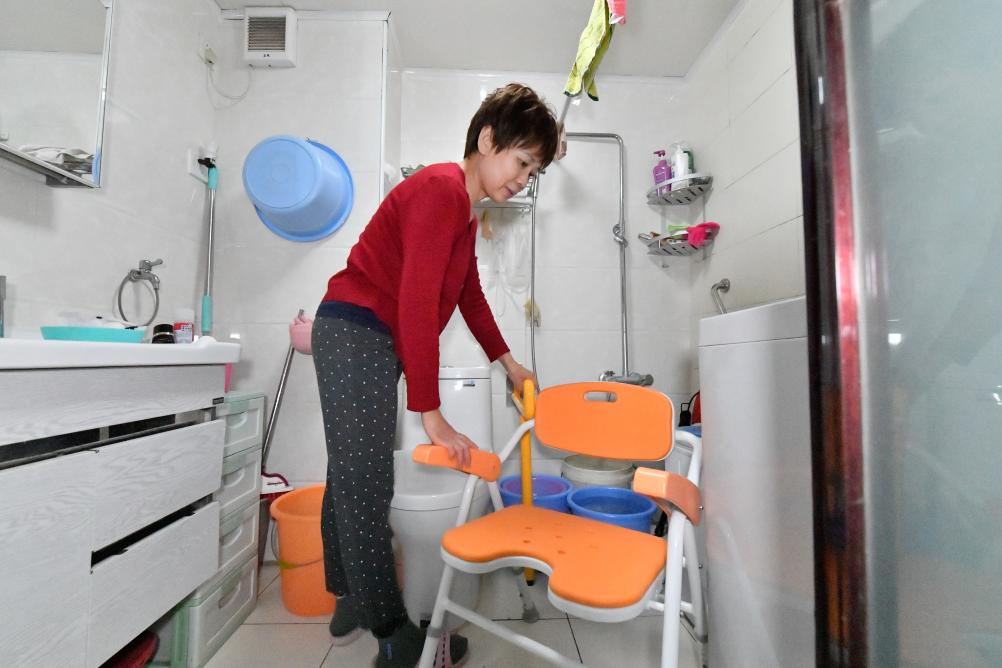 10月17日,在天津市河西區(qū)尖山街道,居民在家中衛(wèi)生間內(nèi)擺放助浴椅、防滑扶手等適老化改造設(shè)施。新華社記者孫凡越 攝