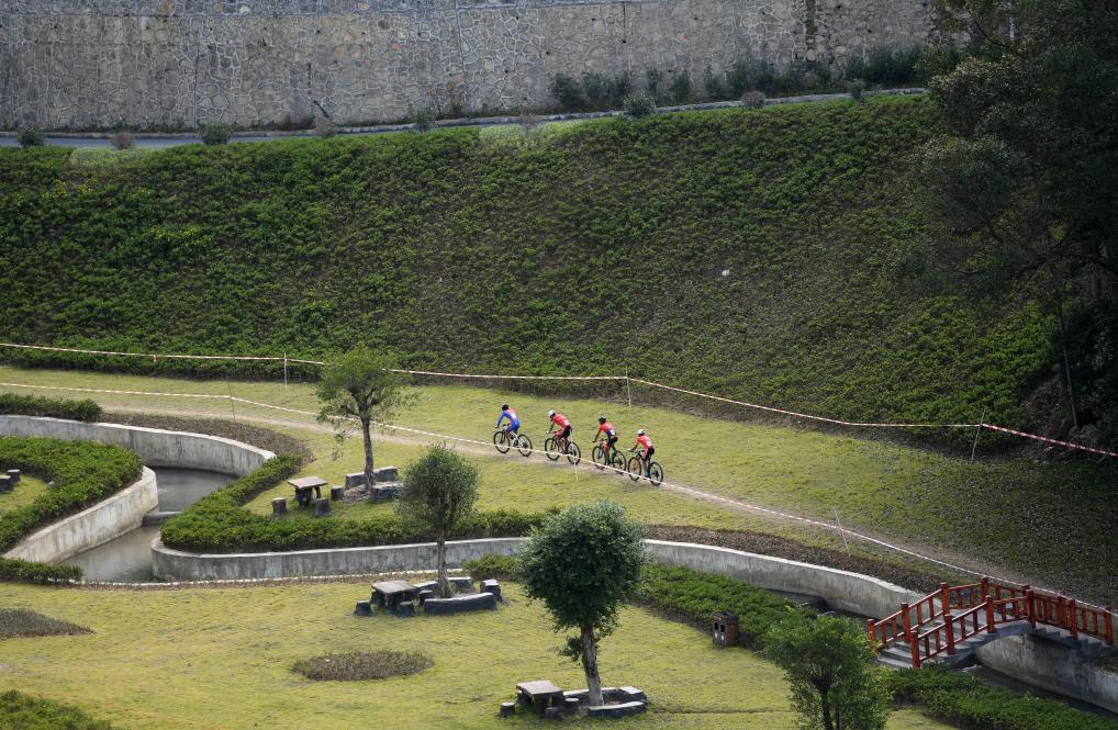 10月28日,參賽選手在第一屆全國學生(青年)運動會男子山地自行車越野賽比賽中。新華社記者 陸波岸 攝