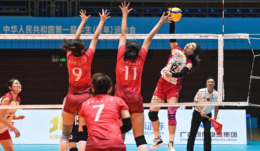 10月31日,第一屆全國學生(青年)運動會(校園組)排球大學女子組小組賽第三輪比賽在廣西欽州舉行。新華社記者 張愛林 攝
