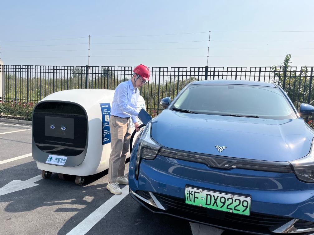 圖為智能移動充電機器人為排隊等候的新能源汽車提供充電服務。新華社發(fā)(沈佳煒攝)