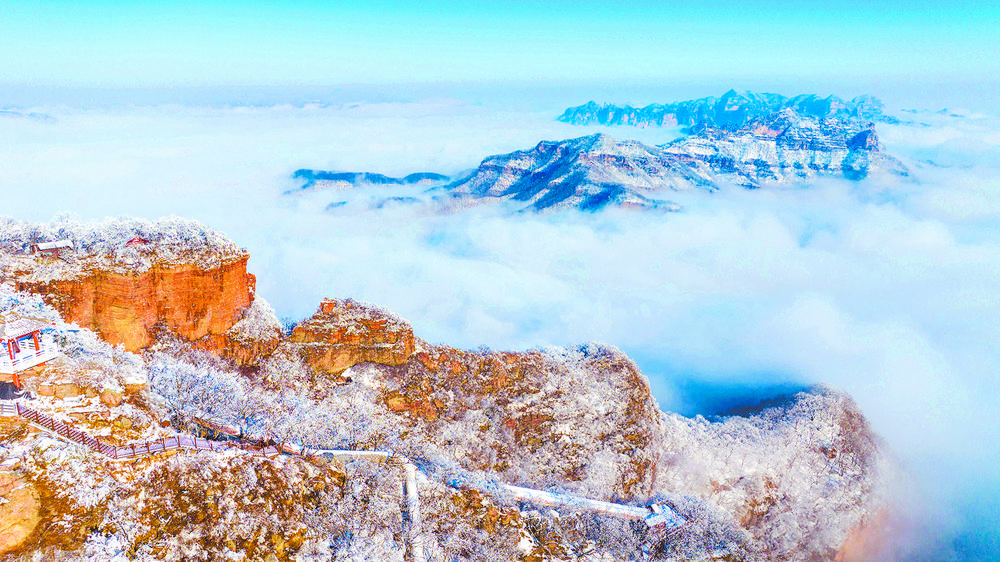 12月12日在河南省濟(jì)源市拍攝的雪后王屋山美景(無人機(jī)照片)。
