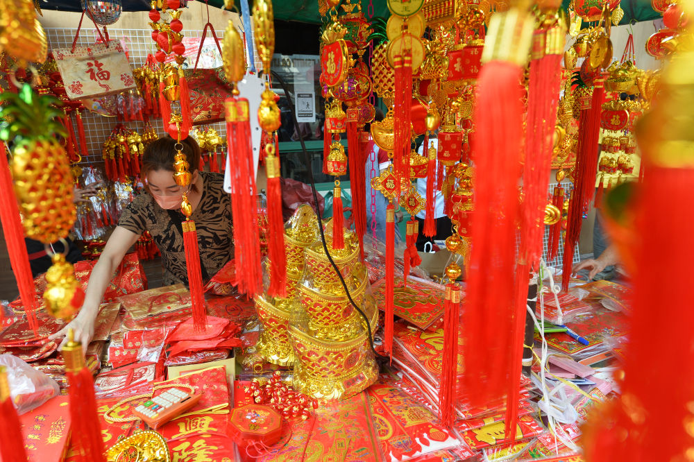 一名商販在泰國曼谷唐人街的攤位上擺放春節(jié)飾品。新華社發(fā)(拉亨攝)