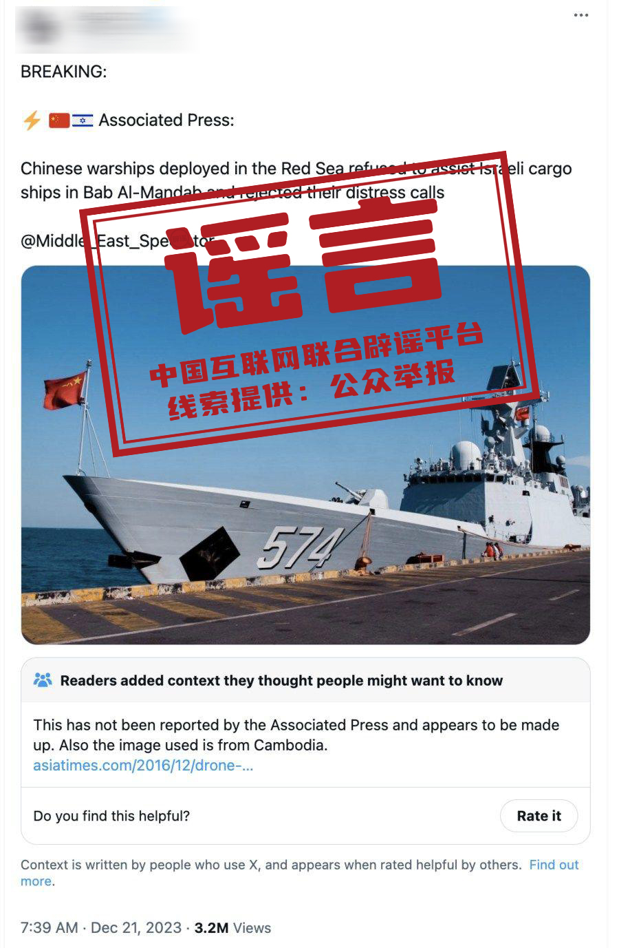 真相:針對“一艘以色列商船向中國海軍烏魯木齊艦進行求助遭到拒絕”的報道,國防部新聞發(fā)言人吳謙在12月28日的例行記者會上回應,這是徹頭徹尾的假消息。另據(jù)新華社25日報道,一個有十多萬“粉絲”的境外社交平臺賬號以美聯(lián)社為“信源”發(fā)帖稱,“中國軍艦在曼德海峽拒絕協(xié)助以色列貨船,且無視他們的呼救。”這一謠言隨即被多個權(quán)威信源辟謠。事實上,美聯(lián)社根本沒有這則報道。(來源:中華人民共和國國防部、新華社)