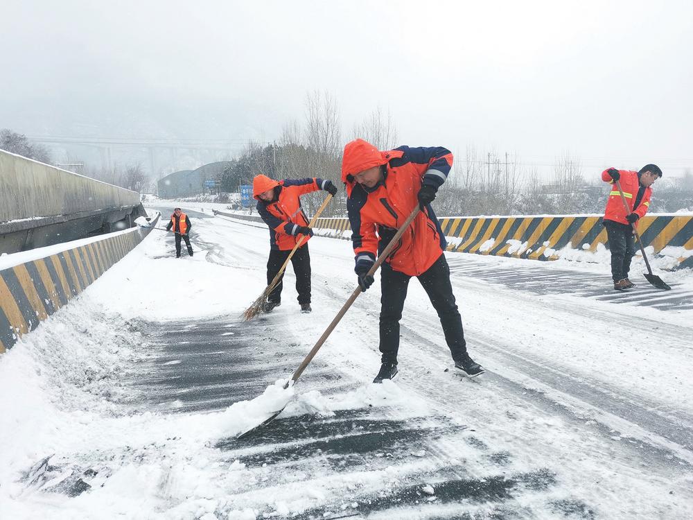 2月21日,公路養(yǎng)護(hù)工人正在曹溝橋清理積雪。