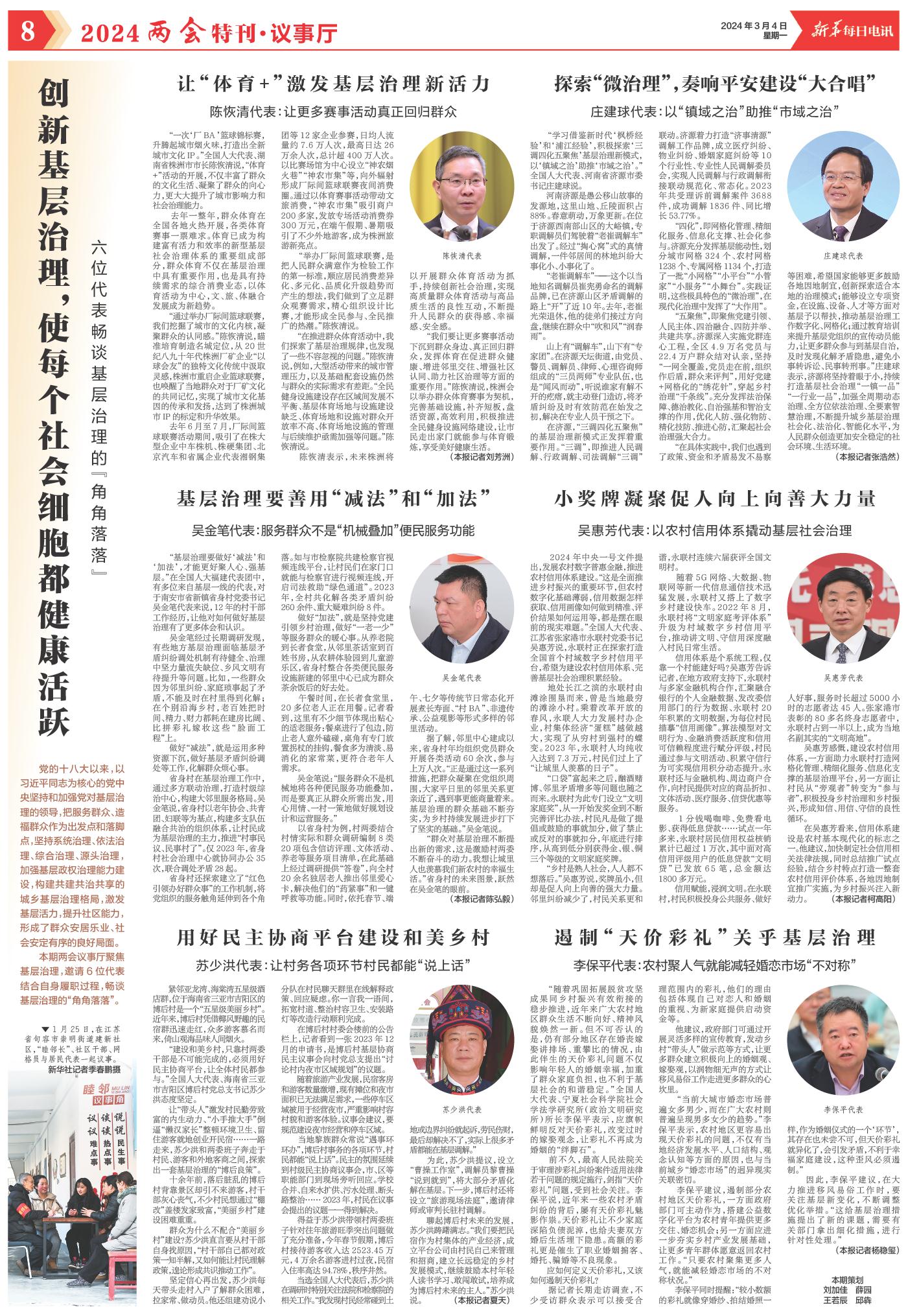 “在具體實(shí)踐中,我們也遇到了政策、資金和矛盾易發(fā)不易察等困難,希望國(guó)家能夠更多鼓勵(lì)各地因地制宜,創(chuàng)新探索適合本地的治理模式;能夠設(shè)立專項(xiàng)資金,在設(shè)施、設(shè)備、人才等方面對(duì)基層予以幫扶,推動(dòng)基層治理工作數(shù)字化、網(wǎng)格化;通過教育培訓(xùn)來提升基層黨組織的宣傳動(dòng)員能力,讓更多群眾參與到基層自治,及時(shí)發(fā)現(xiàn)化解矛盾隱患,避免小事轉(zhuǎn)訴訟、民事轉(zhuǎn)刑事。”莊建球表示,濟(jì)源將堅(jiān)持著眼于小,持續(xù)打造基層社會(huì)治理“一鎮(zhèn)一品”“一行業(yè)一品”,加強(qiáng)全周期動(dòng)態(tài)治理、全方位依法治理、全要素智慧治理,不斷提升城鄉(xiāng)基層治理社會(huì)化、法治化、智能化水平,為人民群眾創(chuàng)造更加安全穩(wěn)定的社會(huì)環(huán)境、生活環(huán)境。