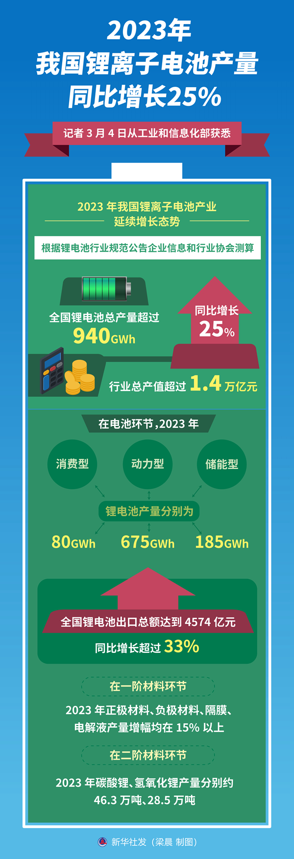 新華社北京3月4日電(記者王悅陽、張辛欣)記者4日從工業(yè)和信息化部獲悉,2023年我國鋰離子電池產(chǎn)業(yè)延續(xù)增長態(tài)勢,根據(jù)鋰電池行業(yè)規(guī)范公告企業(yè)信息和行業(yè)協(xié)會(huì)測算,全國鋰電池總產(chǎn)量超過940GWh,同比增長25%,行業(yè)總產(chǎn)值超過1.4萬億元。