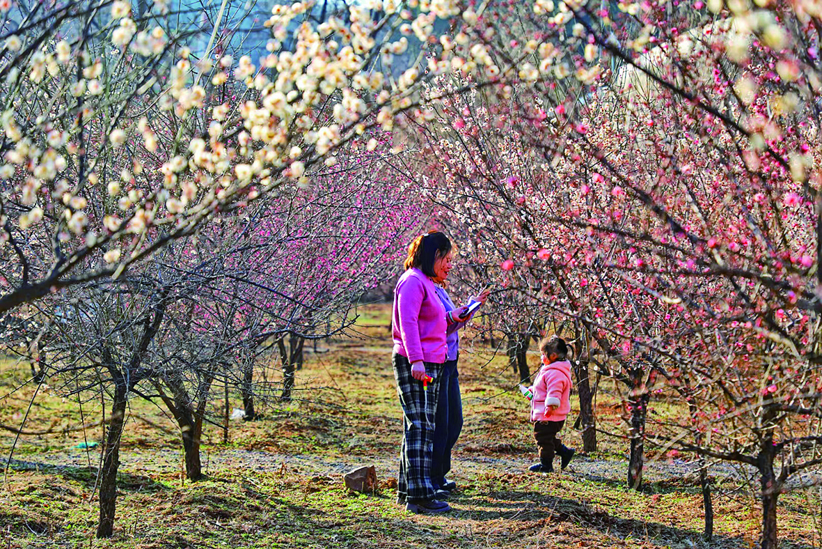 當(dāng)前正值梅花的觀賞期,在遠(yuǎn)離市區(qū)的承留鎮(zhèn)花石村千畝梅園內(nèi),美人梅、南京紅、朱砂梅、宮粉梅、綠梅等次第開放,引來眾多游客觀賞。