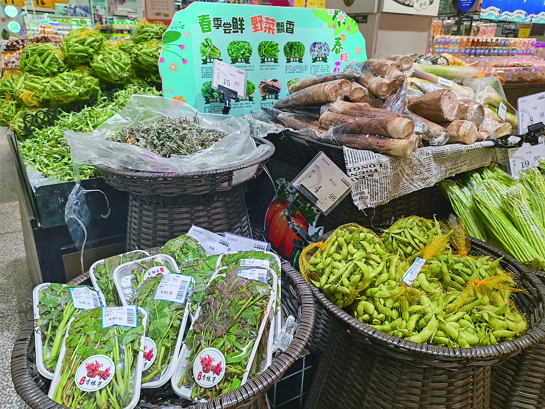 隨后,記者又來(lái)到位于沁園路的某大型超市。在該超市的蔬菜生鮮區(qū),也出現(xiàn)了香椿等野菜的身影,不少市民正在貨架上挑選。