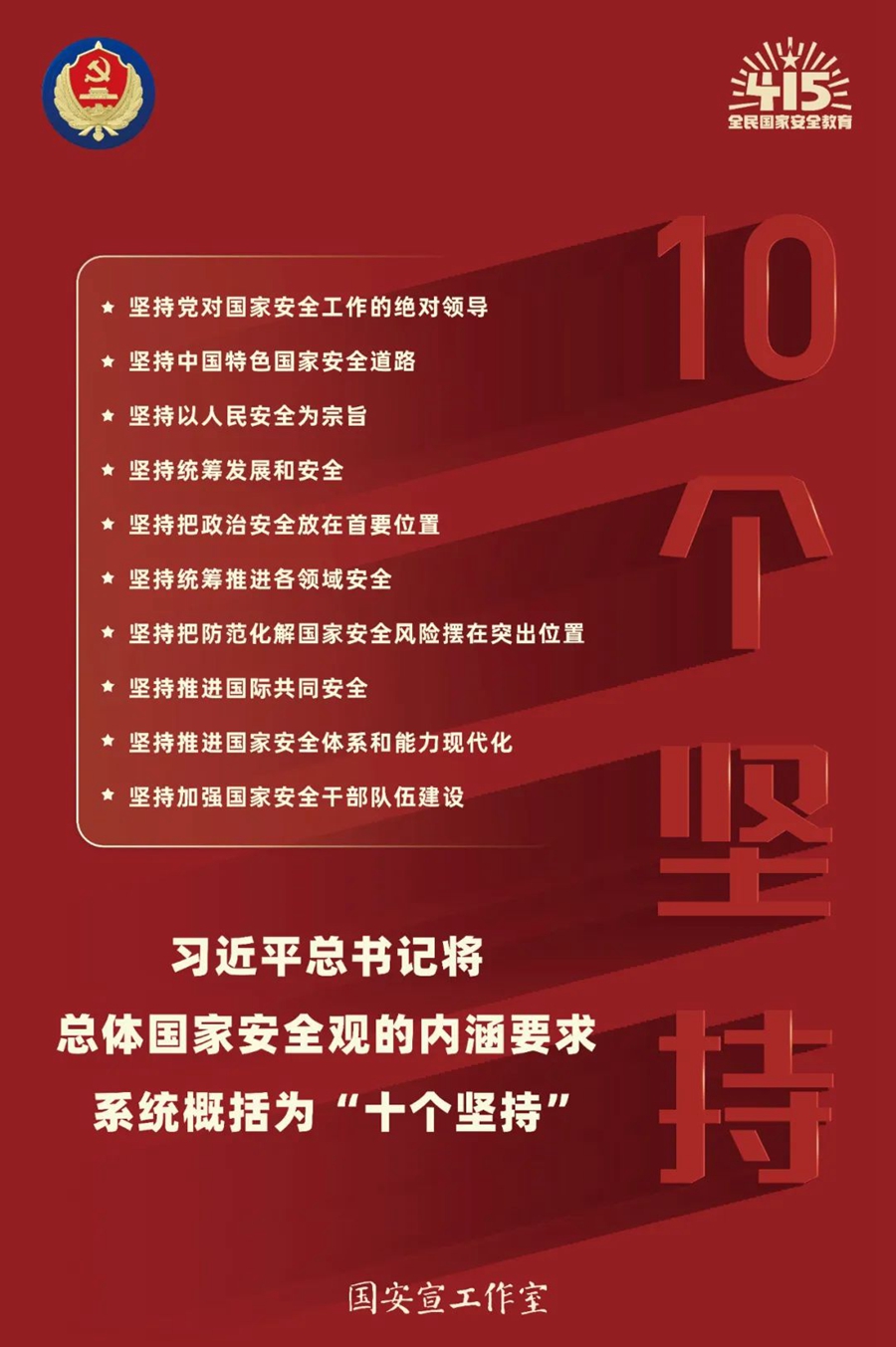 在第七個(gè)全民國(guó)家安全教育日來臨之際,“國(guó)安宣工作室”發(fā)布了“樹牢總體國(guó)家安全觀、感悟新時(shí)代國(guó)家安全成就、為迎接黨的二十大勝利召開營(yíng)造良好氛圍”官宣海報(bào)。