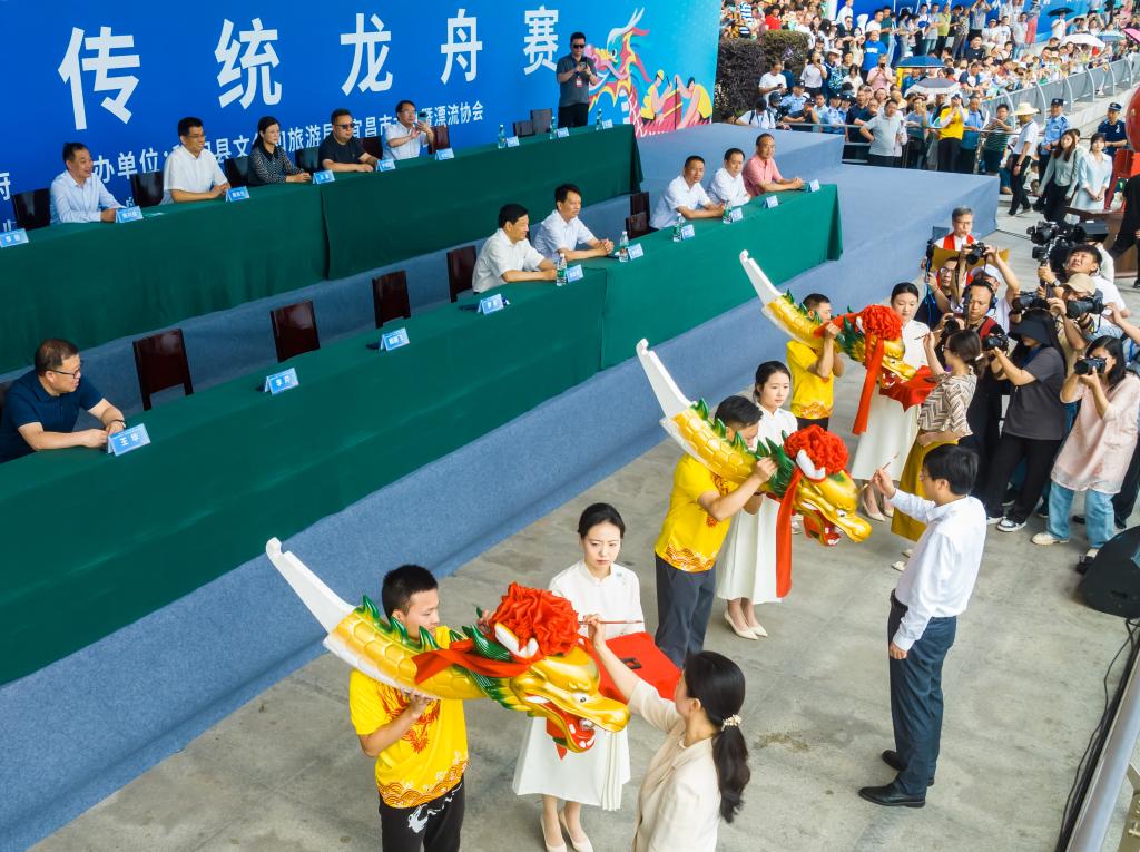 6月10日,湖北省宜昌市秭歸縣舉辦2024屈原故里傳統(tǒng)龍舟賽,嘉賓為龍舟點(diǎn)睛。新華社發(fā)(鄭家裕攝)