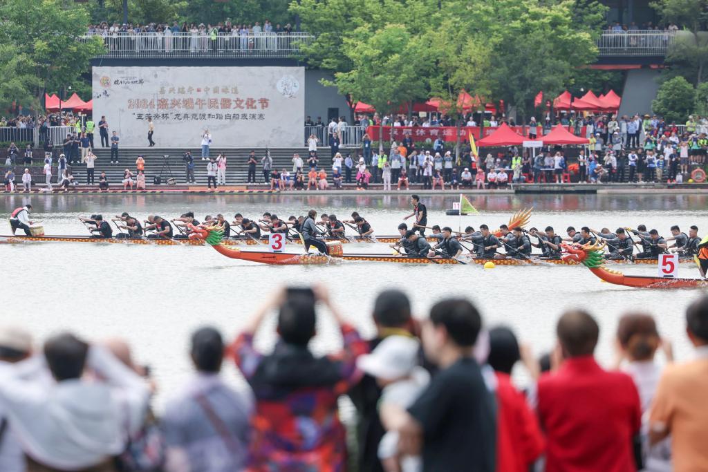 6月2日,浙江省嘉興市南湖區(qū)西南湖水域,精彩的龍舟競(jìng)渡吸引市民觀看。新華社發(fā)(徐志達(dá)攝)