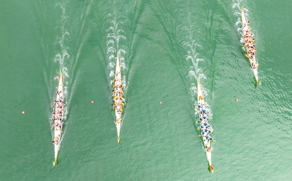 6月10日,湖北省宜昌市秭歸縣舉辦2024屈原故里傳統(tǒng)龍舟賽,參賽選手在參加比賽(無(wú)人機(jī)照片)。新華社發(fā)(鄭家裕攝)