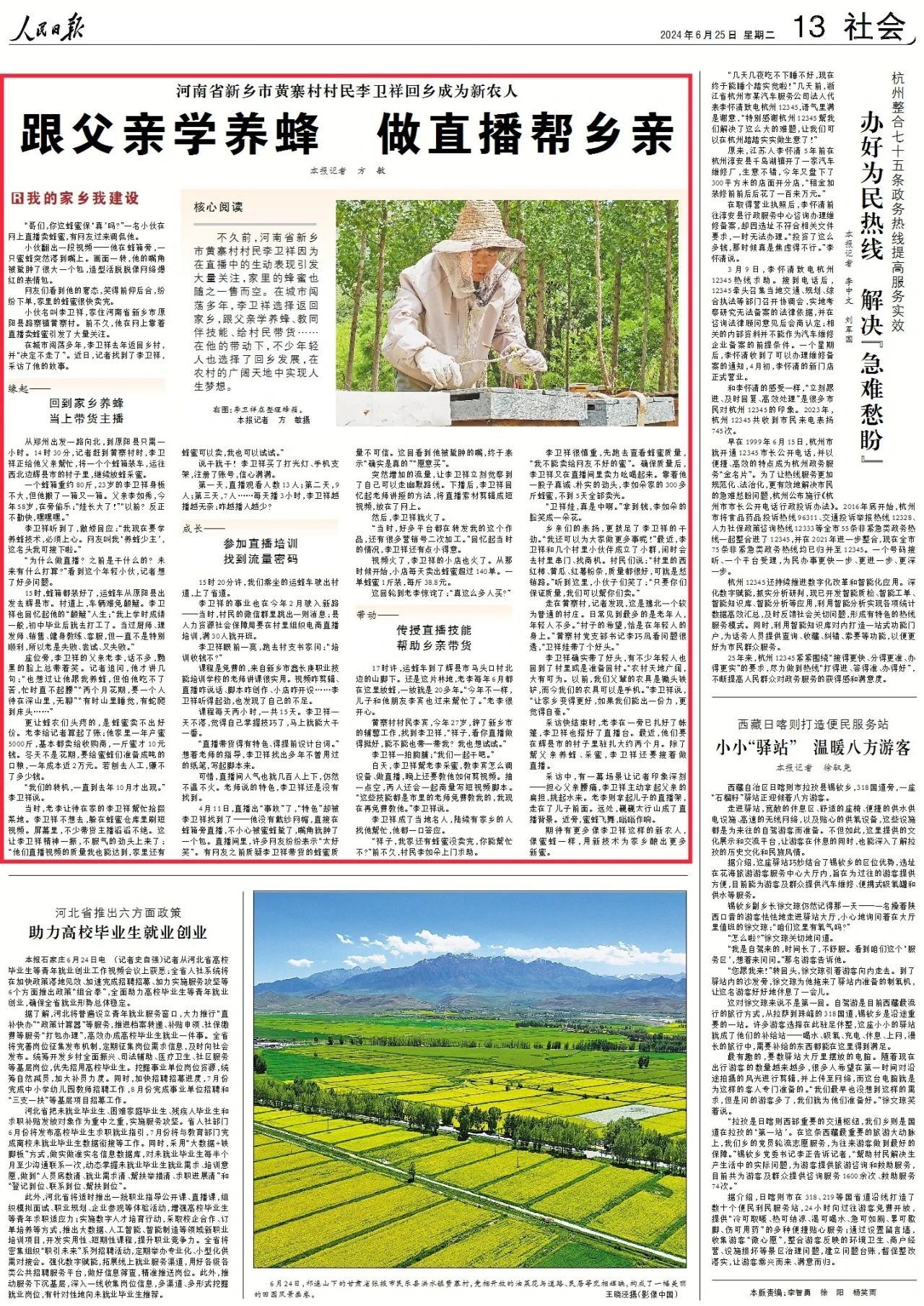 不久前,河南省新鄉(xiāng)市黃寨村村民李衛(wèi)祥因?yàn)樵谥辈ブ械纳鷦?dòng)表現(xiàn)引發(fā)大量關(guān)注,家里的蜂蜜也隨之一售而空。在城市闖蕩多年,李衛(wèi)祥選擇返回家鄉(xiāng),跟父親學(xué)養(yǎng)蜂、教同伴技能、給村民帶貨……在他的帶動(dòng)下,不少年輕人也選擇了回鄉(xiāng)發(fā)展,在農(nóng)村的廣闊天地中實(shí)現(xiàn)人生夢(mèng)想。