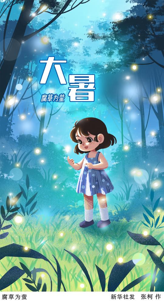 古人認(rèn)為,大暑有三候:一候腐草為螢,二候土潤溽暑,三候大雨時行。這一時節(jié),螢火蟲卵化而出,古人誤認(rèn)為螢火蟲由腐草變化而成;與此同時,天氣悶熱,土地潮濕,還常有雷雨出現(xiàn)。