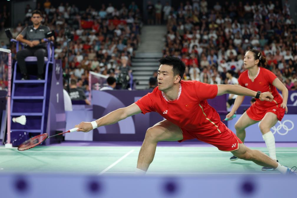 8月1日,中國組合鄭思維(前)/黃雅瓊在羽毛球混合雙打半決賽中。新華社記者 陳斌 攝