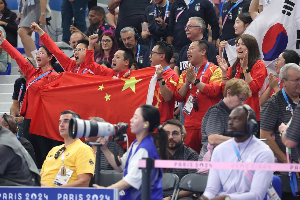 ??8月5日,中國射擊隊成員在現(xiàn)場觀賽。新華社記者 趙丁喆 攝