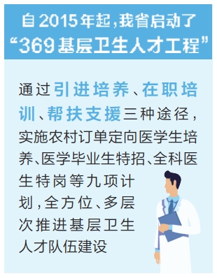 省衛(wèi)生健康委相關(guān)負(fù)責(zé)人介紹,自2015年起,我省啟動(dòng)了“369基層衛(wèi)生人才工程”,通過(guò)引進(jìn)培養(yǎng)、在職培訓(xùn)、幫扶支援三種途徑,實(shí)施農(nóng)村訂單定向醫(yī)學(xué)生培養(yǎng)、醫(yī)學(xué)畢業(yè)生特招、全科醫(yī)生特崗等九項(xiàng)計(jì)劃,全方位、多層次推進(jìn)基層衛(wèi)生人才隊(duì)伍建設(shè)。