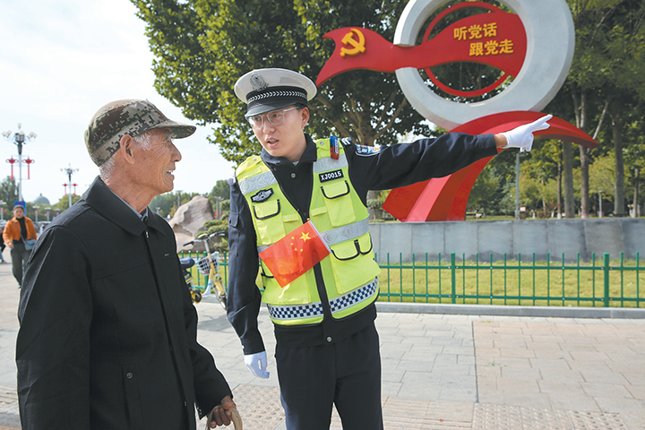 10月3日,在沁園路與濟(jì)源大道交叉口,值勤民警為老人提供幫助。