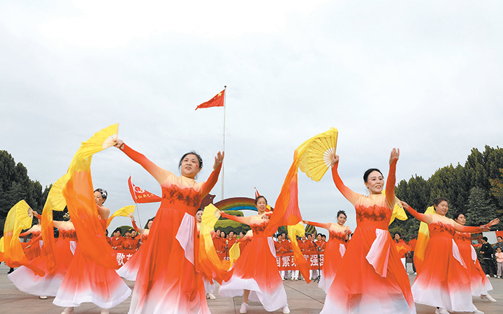 10月1日,群眾在世紀(jì)廣場載歌載舞,祝福祖國生日快樂。