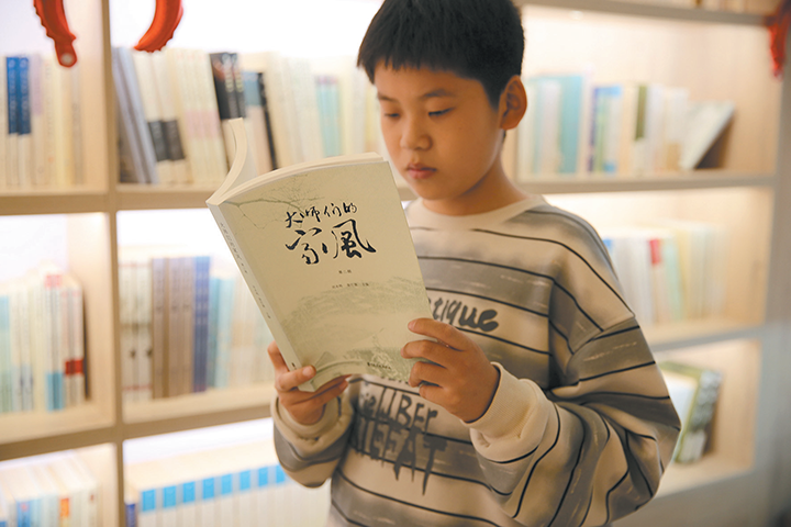 10月7日,一個(gè)小學(xué)生在新華書店品味書香。