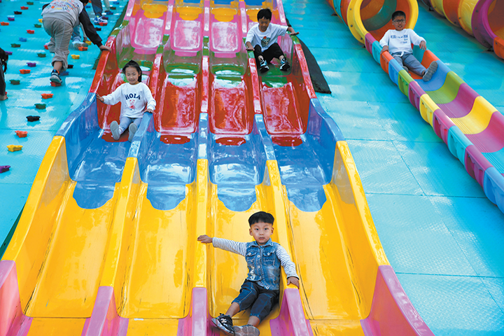 10月2日,孩子們在牡丹園體驗(yàn)彩虹滑道。