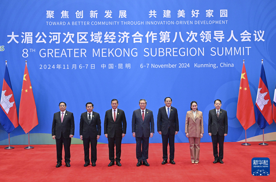 11月7日,國務(wù)院總理李強(qiáng)在昆明出席大湄公河次區(qū)域經(jīng)濟(jì)合作第八次領(lǐng)導(dǎo)人會議。這是李強(qiáng)同出席會議的柬埔寨、老撾、緬甸、泰國、越南政府首腦和亞洲開發(fā)銀行行長合影。新華社記者 殷博古 攝