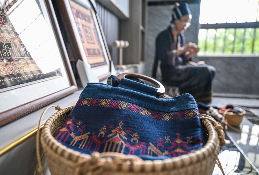 這是在海南省東方市東河鎮(zhèn)拍攝的黎族傳統(tǒng)紡染織繡技藝省級(jí)傳承人符永英用黎錦制作的手袋(2023年6月7日攝)。新華社記者 蒲曉旭 攝