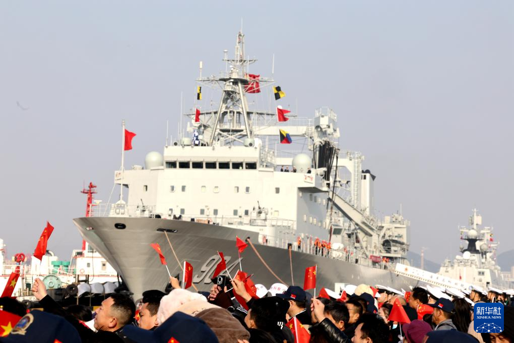 ??上午9時許,伴隨著嘹亮的軍樂聲,編隊艦艇依次解纜,緩緩駛離碼頭。甲板上,任務(wù)官兵整齊列隊,向祖國和親人揮手告別。