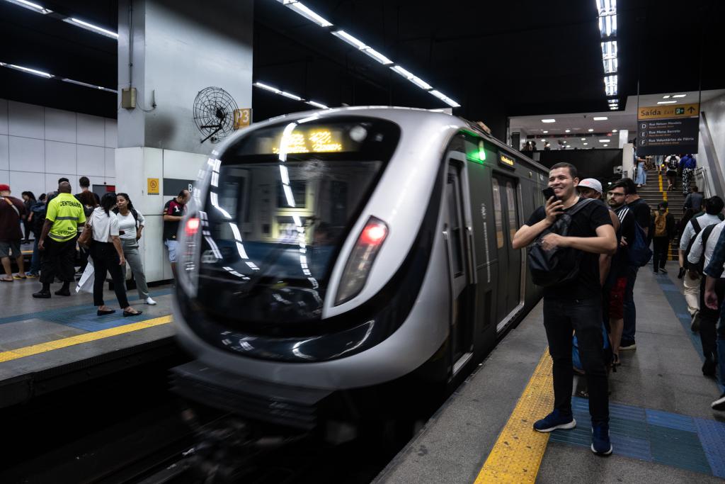 ??11月13日,在巴西里約熱內(nèi)盧博塔弗戈地鐵站,一輛由中車長春軌道客車股份有限公司制造的地鐵列車駛?cè)胝九_(tái)。新華社記者王天聰攝
