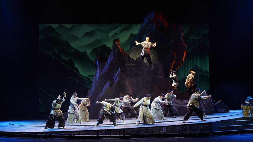 《愚公移山》故事原文一共三百一十字,整個(gè)故事簡(jiǎn)略且缺少戲劇張力,最要緊的是這則故事家喻戶曉、婦孺皆知,可供發(fā)揮的空間有限。如何將三百余字篇幅的寓言故事搬上舞臺(tái),擴(kuò)展成近兩個(gè)小時(shí)的舞臺(tái)說(shuō)唱表演?如何將大家滾瓜爛熟的故事講出新意?如何讓傳統(tǒng)文化的內(nèi)核和當(dāng)代精神鏈接,引起當(dāng)代人特別是當(dāng)代青年人的共鳴?說(shuō)唱音樂(lè)劇《愚公移山》通過(guò)一系列的“新”交出了令人滿意的答卷。