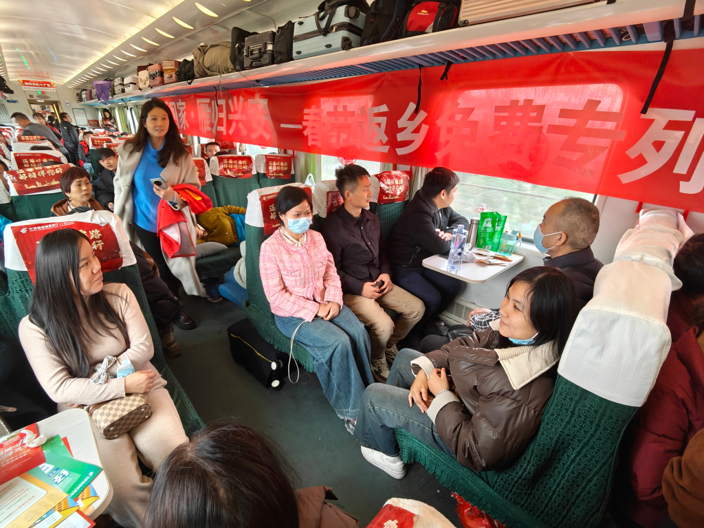 ??鄉(xiāng)音親切。返鄉(xiāng)專列上,他們一路擺起了“龍門陣”。
