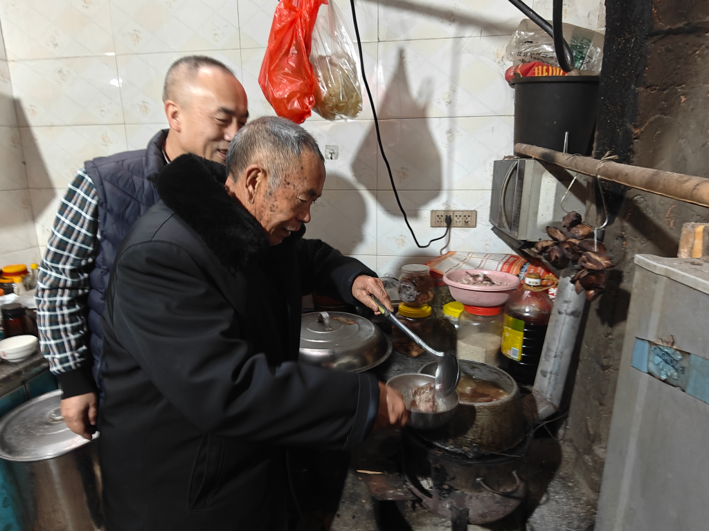 1月26日,78歲的父親藍(lán)光柏給到家的兒子藍(lán)先進(jìn)盛菜。新華社記者 謝佼 攝