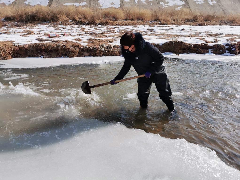 ??臨洮水文站的工作人員在觀測點人工破冰。(受訪者供圖)
