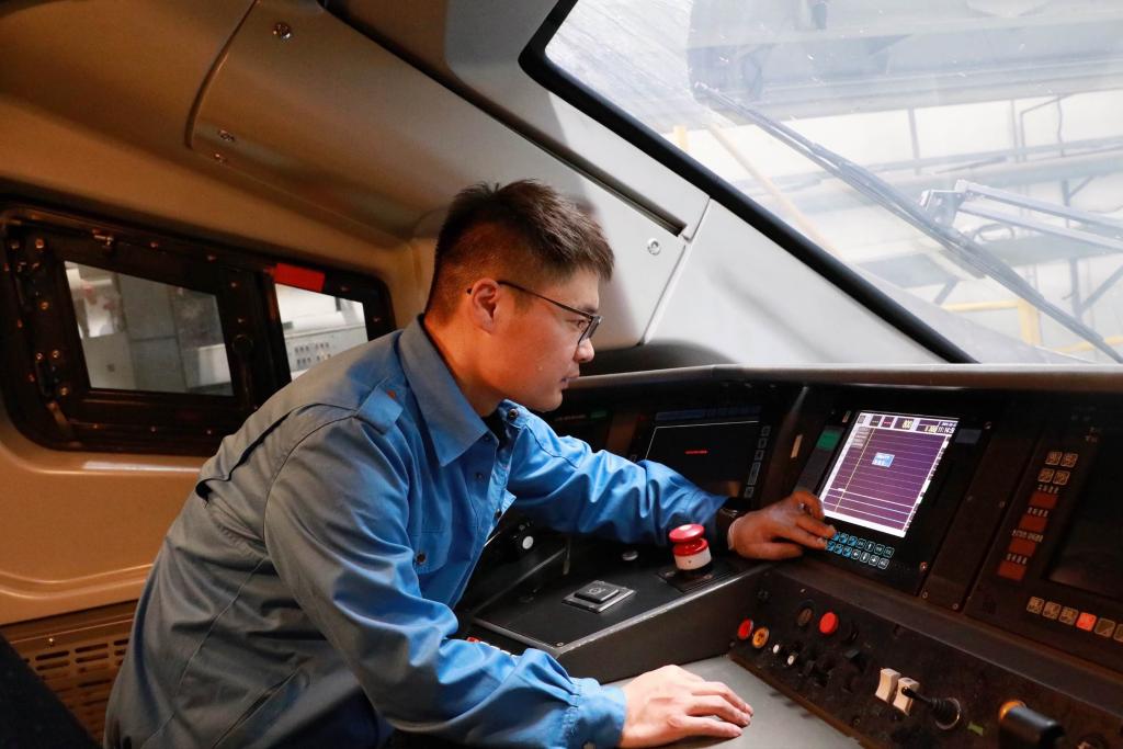 ??隊伍領(lǐng)頭的小伙,是來自中國鐵路北京局石家莊電務(wù)段動車車載設(shè)備車間的工長呂明明。進入駕駛室,他一邊操作筆記本電腦,一邊對著各類面板、指示燈、插頭仔細(xì)檢查。穿車身、鉆車底、趴車頂,用40分鐘檢查完了動車組一側(cè)車頭。