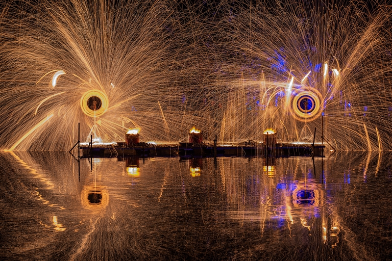 然而,看似剎那絕美的鐵花,想要打得圓滿并非易事。先打石頭后打沙,清水能打一丈八,才能開始打鐵花。鐵水溫度高達1600攝氏度,打的時候人要光著膀子,只有把鐵水打高打散,落下來的鐵花跟水霧一樣,才能不那么燙。“打鐵花確實具有一定的危險性,但看到那些真的熱愛打鐵花這門手藝的年輕人,我感到非常開心?!睏罱ㄜ娬f。