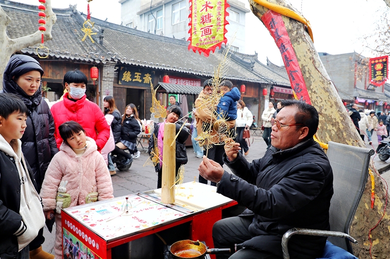 2月3日,在襄城縣明清古街新年廟會上,一位民間藝人正在制作糖畫。呂科 攝