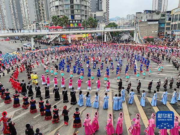 12日,德江縣城里還舉行了舞龍巡游表演,除了88支舞龍隊伍外,還有秧歌隊、腰鼓隊、千人土家擺手舞等方隊,表演者身著盛裝,伴著鑼鼓聲載歌載舞,隊伍綿延幾公里。