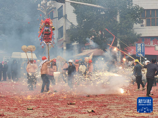 2月12日,德江縣城舉行舞龍炸龍民俗活動。新華社記者 施錢貴 攝