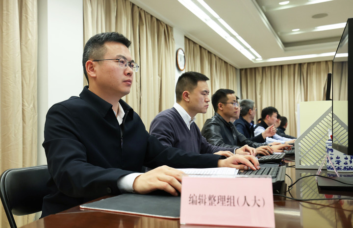 ??3月5日,國辦工作人員對材料進(jìn)行審核匯編。新華社記者 盧燁 攝
