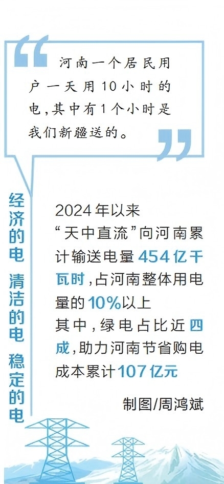 經濟的電、清潔的電、穩(wěn)定的電。在國網新疆電力有限公司能源大數據中心,實時數據顯示,2024年以來,“天中直流”向河南累計輸送電量454億千瓦時,占河南整體用電量的10%以上。其中,綠電占比近四成,助力河南節(jié)省購電成本累計107億元。