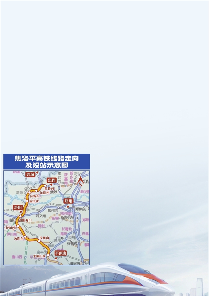 新建焦洛平高鐵是國家《中長期鐵路網(wǎng)規(guī)劃》中八縱之一“呼南通道”的組成部分,設(shè)計時速350公里,線路起自鄭太高鐵玨山線路所,向南經(jīng)焦作市轄沁陽市,濟(jì)源市,跨黃河后引入鄭西高鐵洛陽龍門站,經(jīng)洛陽市伊川、汝陽縣,平頂山市轄汝州市,接入鄭渝高鐵平頂山西站,新建線路長229.2公里,計劃總工期4年。