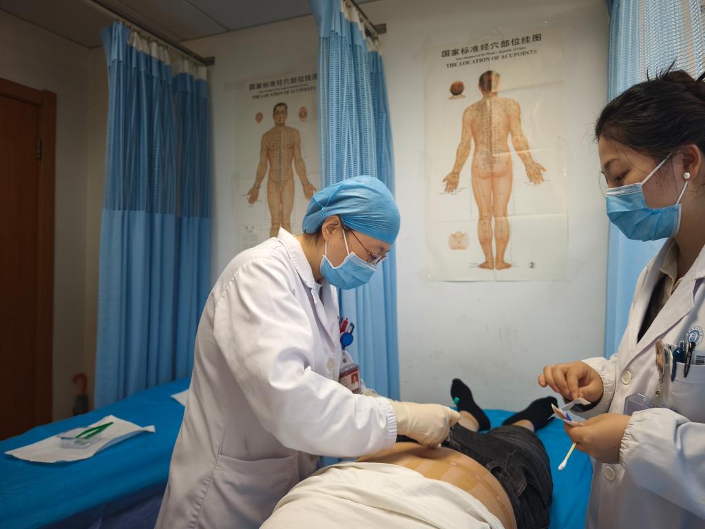 安徽省針灸醫(yī)院內分泌科主任醫(yī)師費愛華(左)為一位肥胖者開展埋線治療(4月7日攝)。新華社記者 郭晨 攝