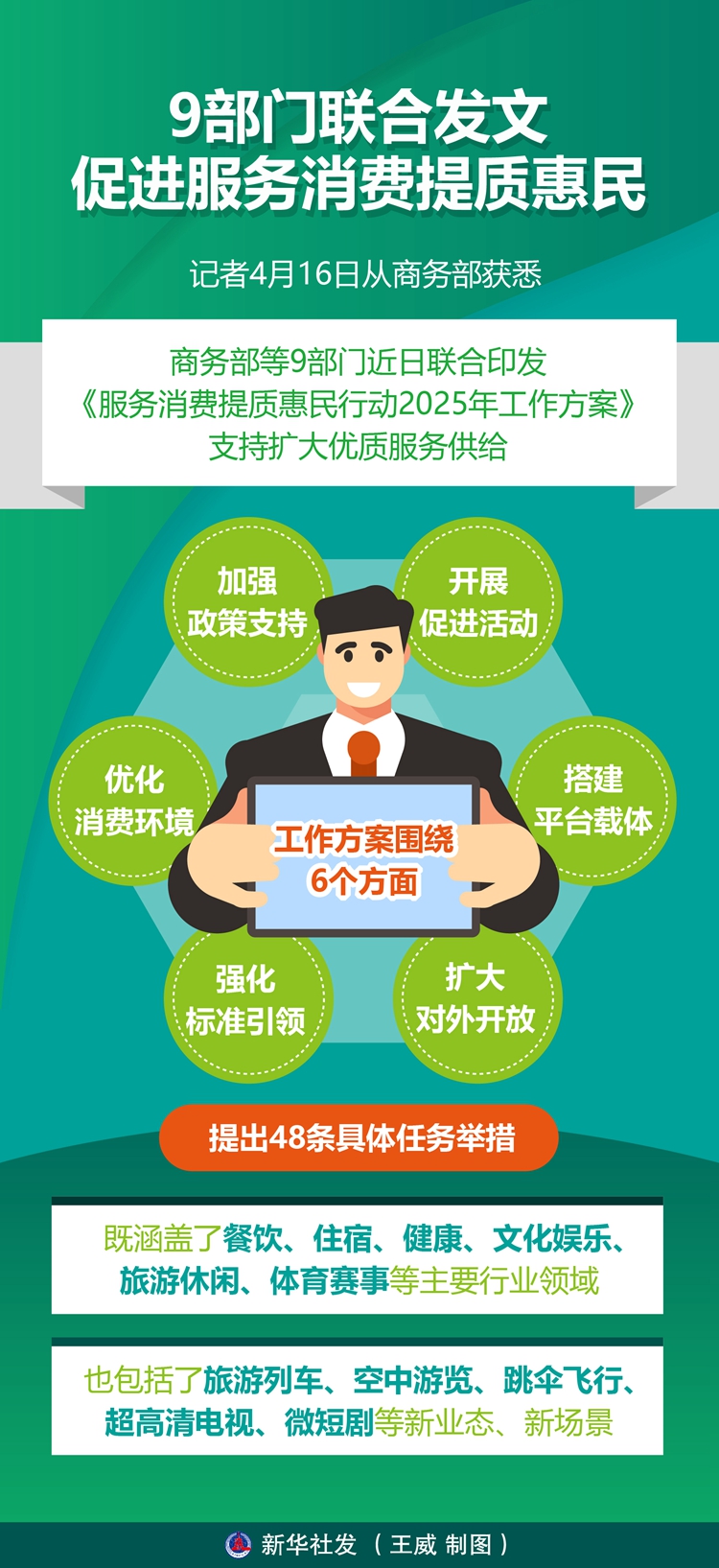 ??工作方案圍繞加強政策支持、開展促進活動、搭建平臺載體、擴大對外開放、強化標準引領、優(yōu)化消費環(huán)境等6個方面,提出48條具體任務舉措,既涵蓋了餐飲、住宿、健康、文化娛樂、旅游休閑、體育賽事等主要行業(yè)領域,也包括了旅游列車、空中游覽、跳傘飛行、超高清電視、微短劇等新業(yè)態(tài)、新場景。