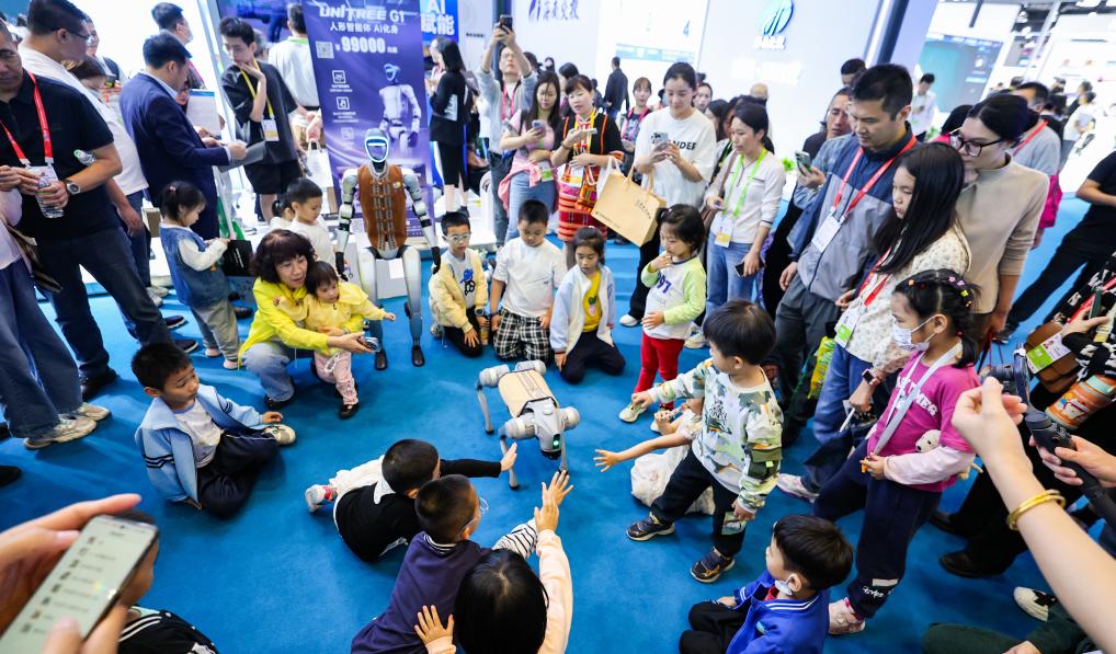 4月13日,在第五屆消博會現(xiàn)場,小朋友和宇樹科技展示的機(jī)器狗互動(dòng)。新華社記者 楊冠宇 攝