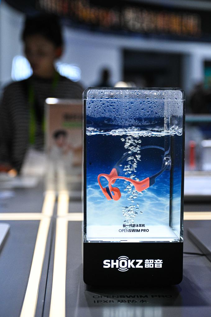 第五屆消博會韶音展臺上的新一代游泳耳機(jī)。新華社記者 蒲曉旭 攝