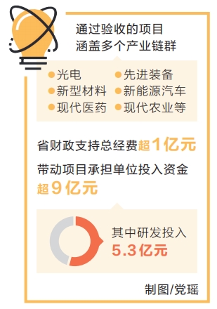此次通過驗收的項目涵蓋光電、先進裝備、新型材料、新能源汽車、現(xiàn)代醫(yī)藥、現(xiàn)代農(nóng)業(yè)等多個產(chǎn)業(yè)鏈群,省財政支持總經(jīng)費超1億元,帶動項目承擔(dān)單位投入資金超9億元,其中研發(fā)投入5.3億元,財政資金撬動效應(yīng)顯著,一批標(biāo)志性成果脫穎而出。