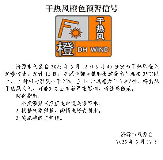 濟(jì)源市氣象臺(tái)發(fā)布干熱風(fēng)橙色預(yù)警信號(hào)