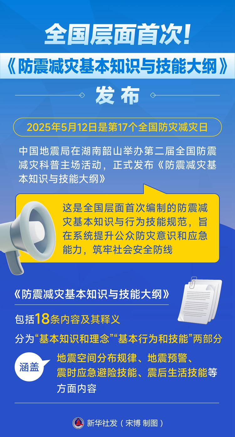 ??新華社長(zhǎng)沙5月12日電(記者 余春生)今年5月12日是第17個(gè)全國(guó)防災(zāi)減災(zāi)日。當(dāng)天,中國(guó)地震局在湖南韶山舉辦第二屆全國(guó)防震減災(zāi)科普主場(chǎng)活動(dòng),正式發(fā)布《防震減災(zāi)基本知識(shí)與技能大綱》,這是全國(guó)層面首次編制的防震減災(zāi)基本知識(shí)與行為技能規(guī)范,旨在系統(tǒng)提升公眾防災(zāi)意識(shí)和應(yīng)急能力,筑牢社會(huì)安全防線。