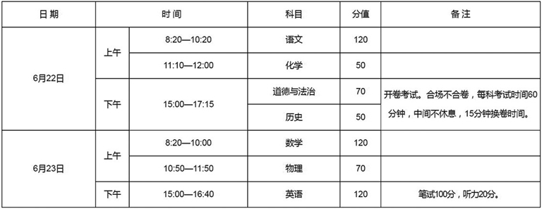 今年中招考試時(shí)間為6月22日—23日。實(shí)行全省統(tǒng)一命題、統(tǒng)一試卷、統(tǒng)一考試時(shí)間。各地按照國(guó)家和省有關(guān)要求,統(tǒng)一制訂本轄區(qū)的考試招生工作方案,負(fù)責(zé)考務(wù)、閱卷和錄取工作。